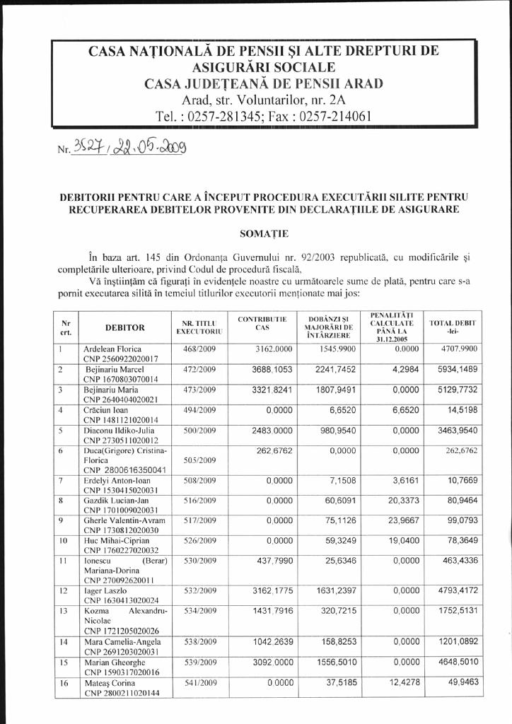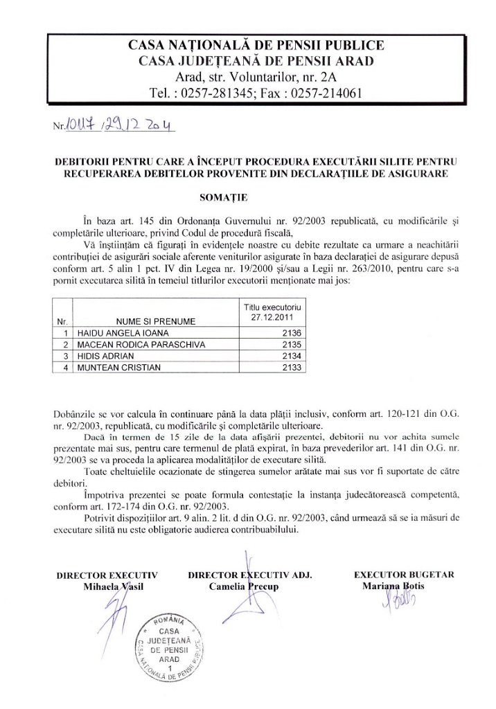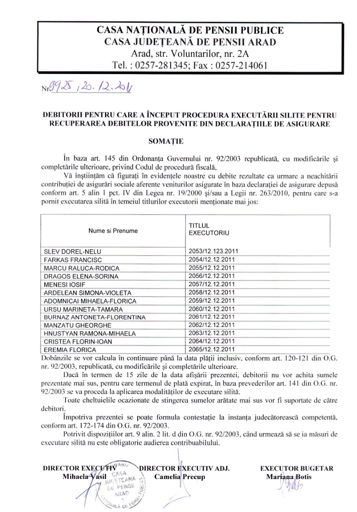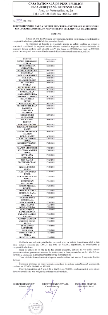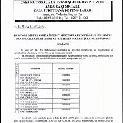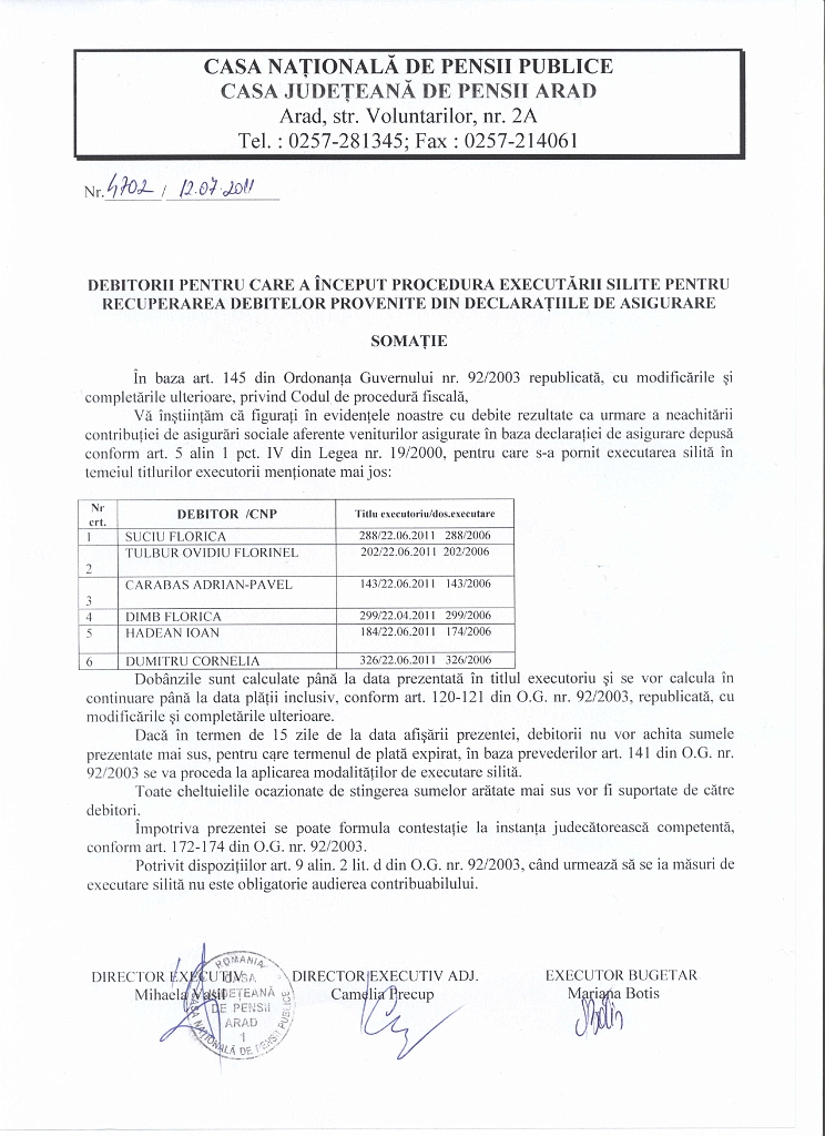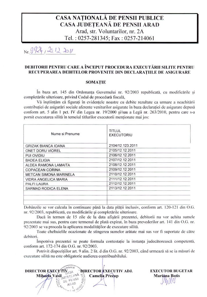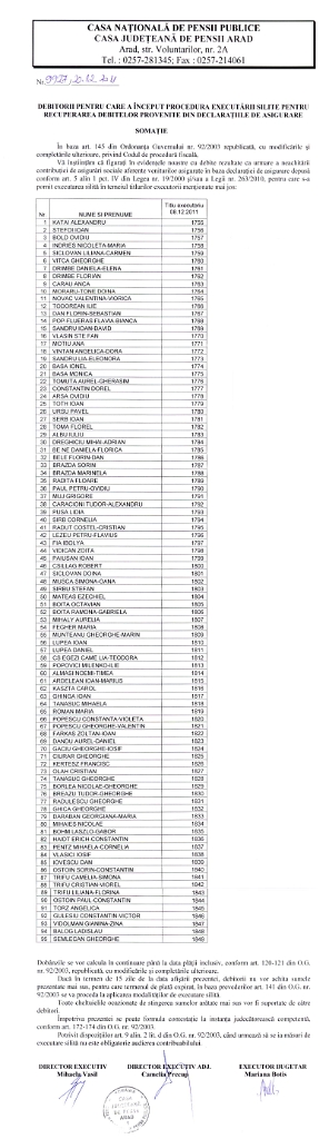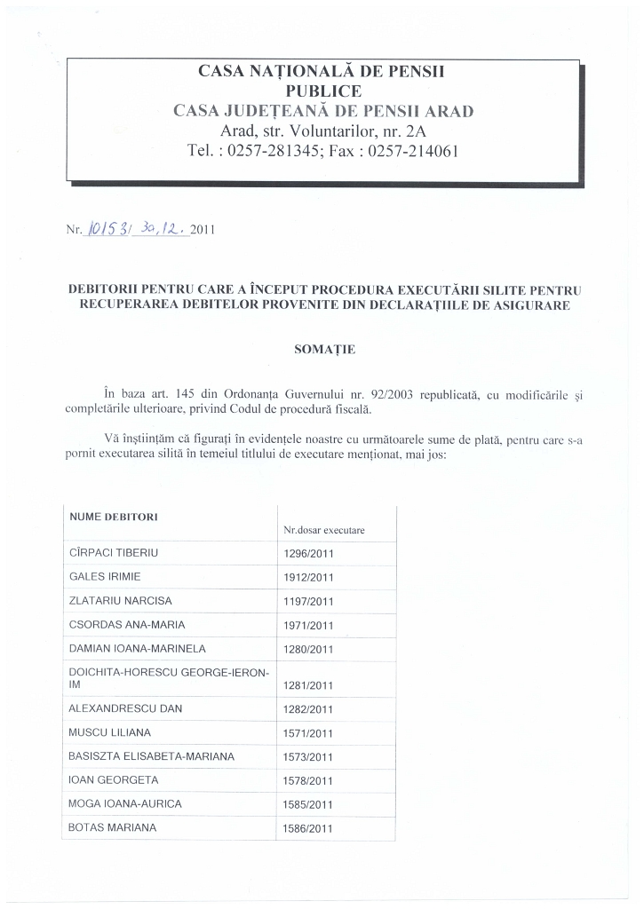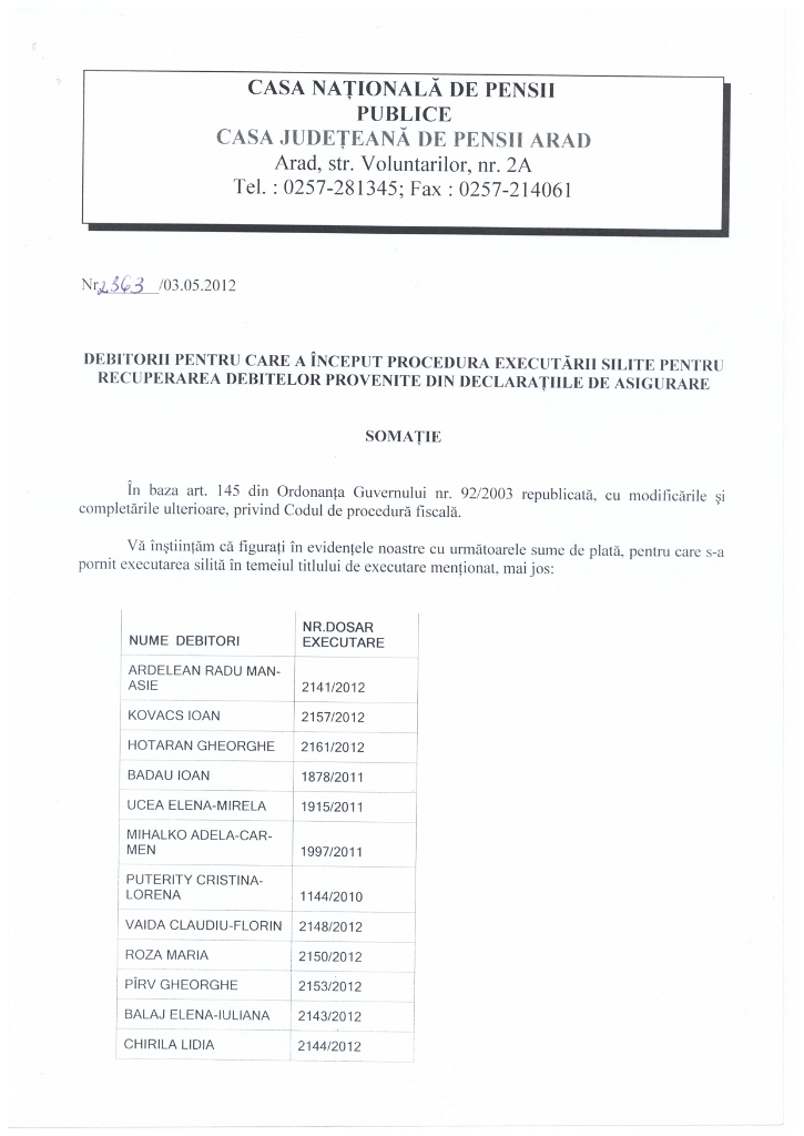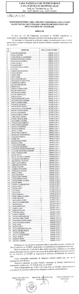 In temeiul art.44 alin.(2) lit.d si alin.(3) din OG nr.92/2003 privind codul de procedura fiscala asa cum a fost modificat si completat, Casa Judeteana de Pensii Arad, procedeaza la comunicarea prin publicitate a somatiilor pentru un numar de 105 debitori, persoane asigurate pe baza de declaratie de asigurare conform art. 5 alin.1 pct. IV din Legea nr.19/2000 cu modificarile si completarile ulterioare.