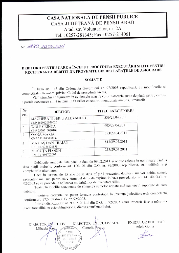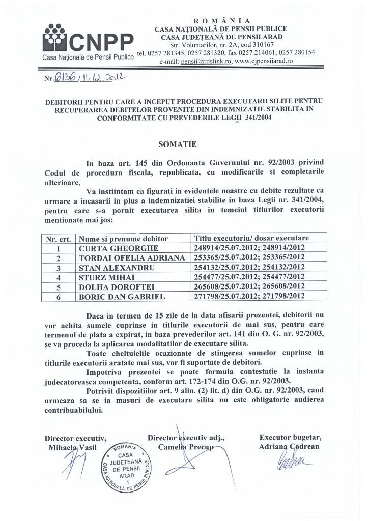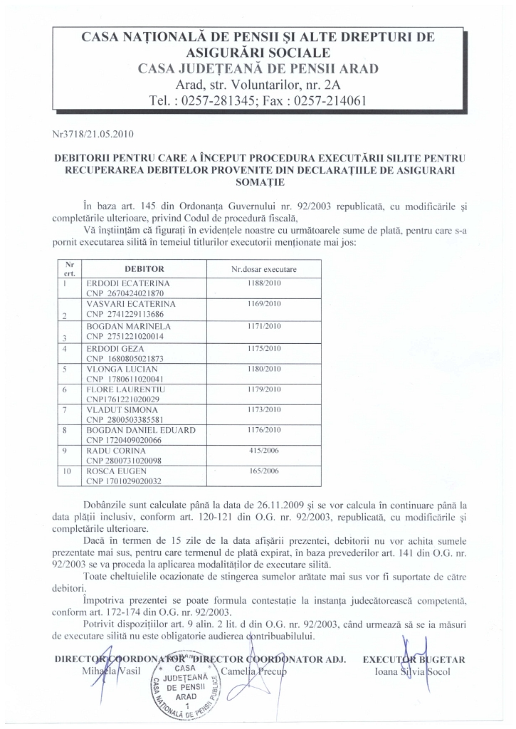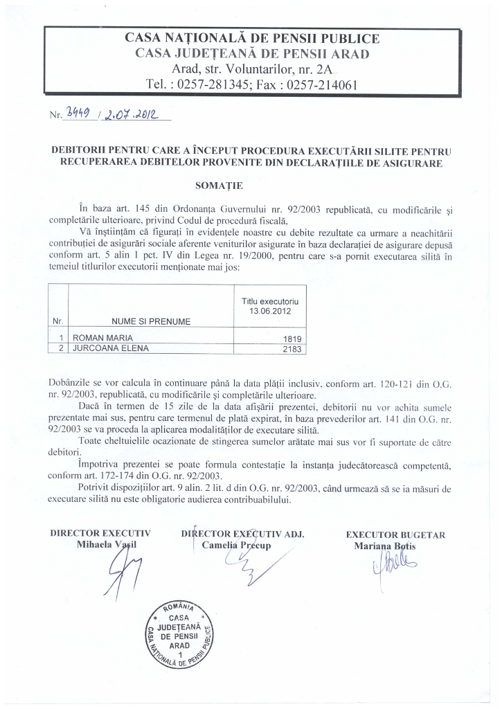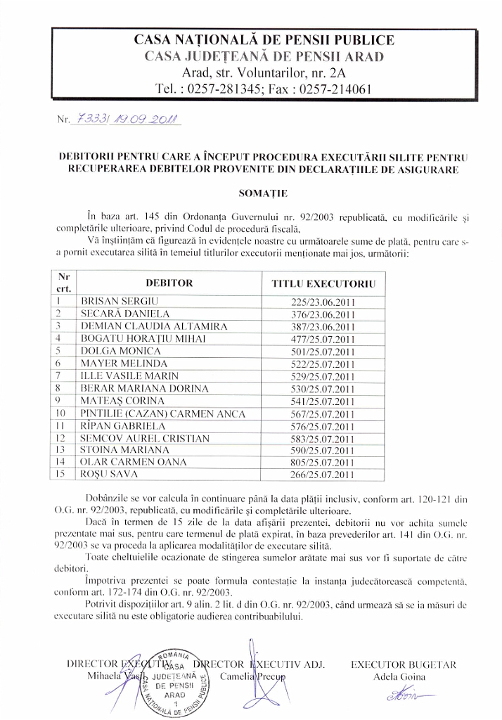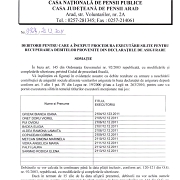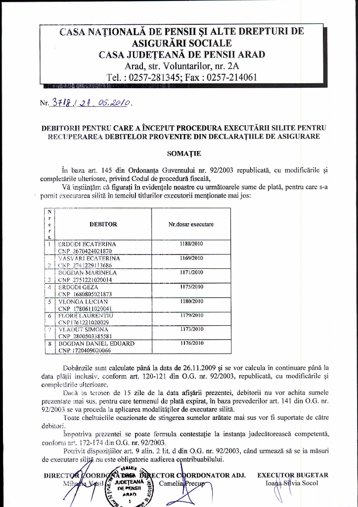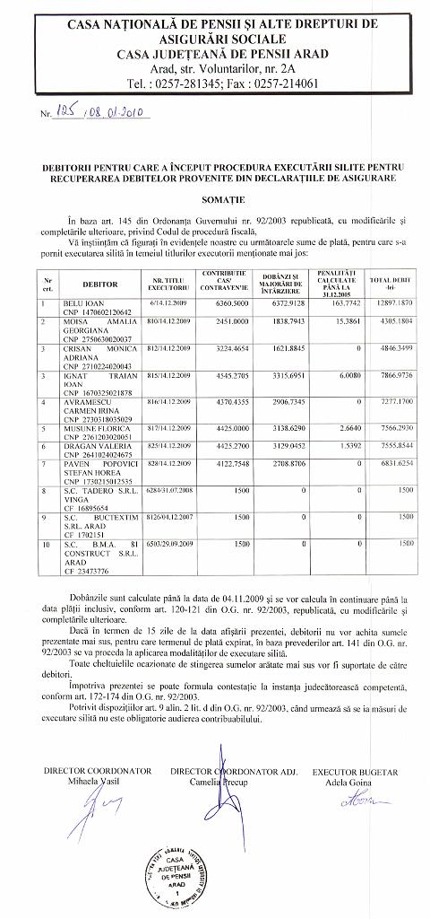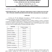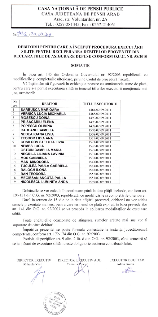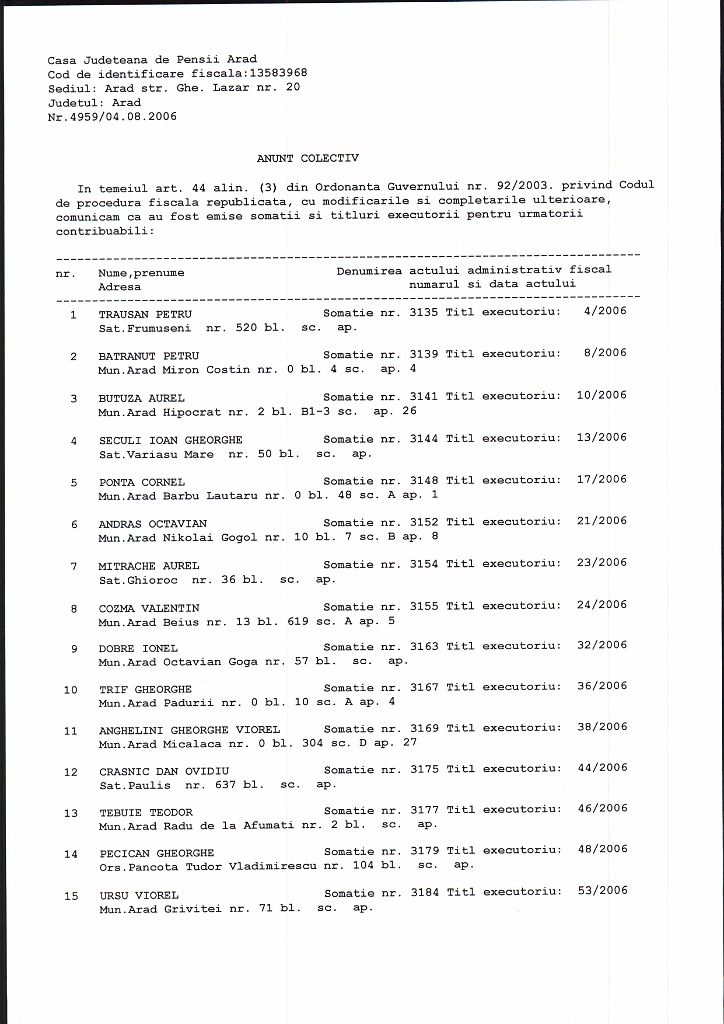 In temeiul art.44 alin.(2) lit.d si alin.(3) din OG nr.92/2003 privind codul de procedura fiscala asa cum a fost modificat si completat, Casa Judeteana de Pensii Arad, procedeaza la comunicarea prin publicitate a somatiilor pentru un numar de 105 debitori, persoane asigurate pe baza de declaratie de asigurare conform art. 5 alin.1 pct. IV din Legea nr.19/2000 cu modificarile si completarile ulterioare.