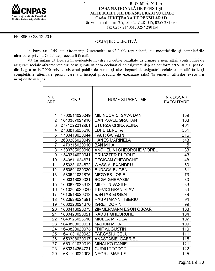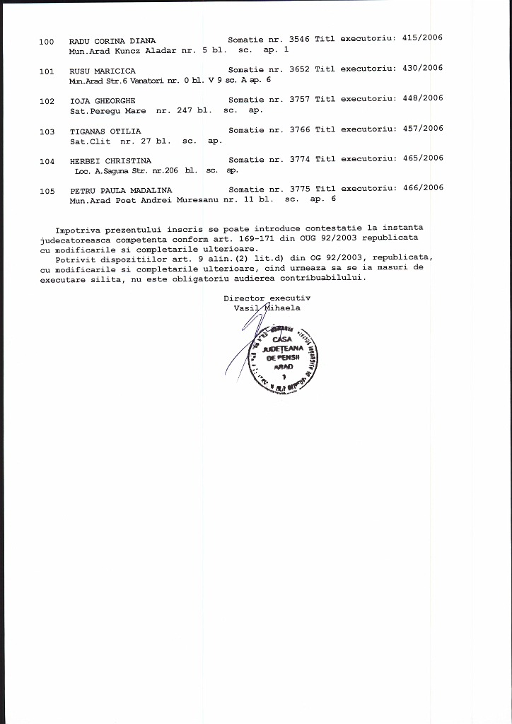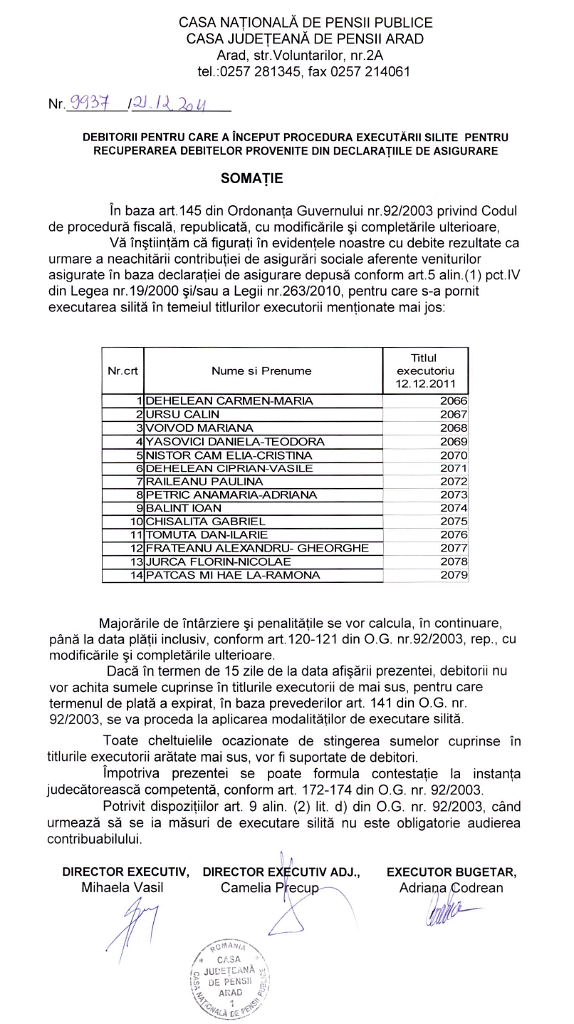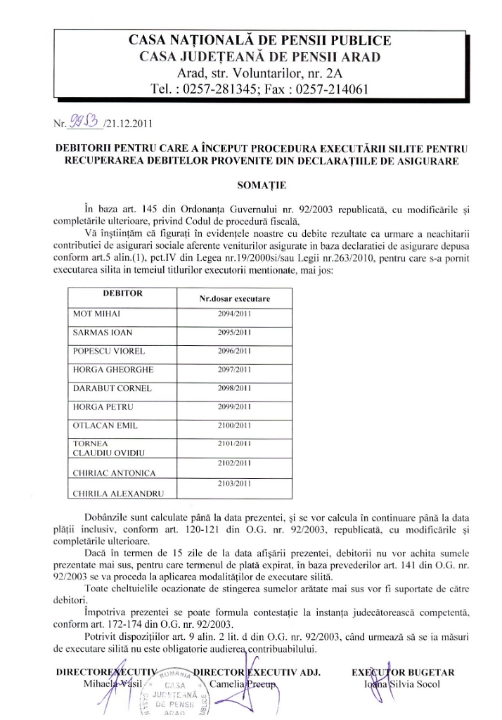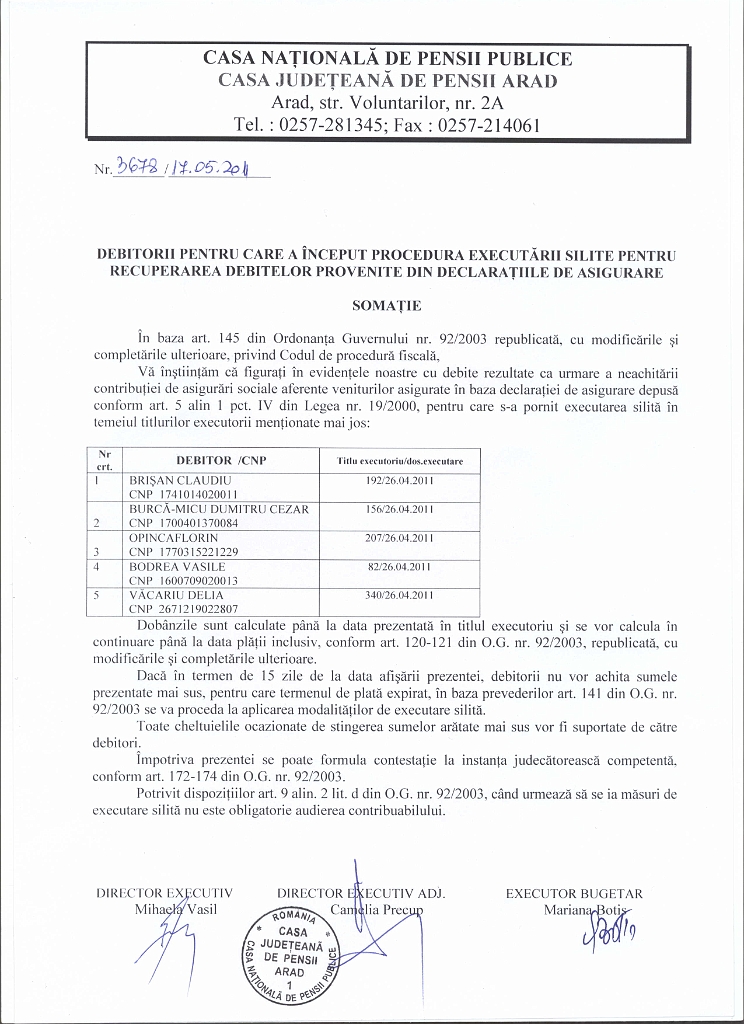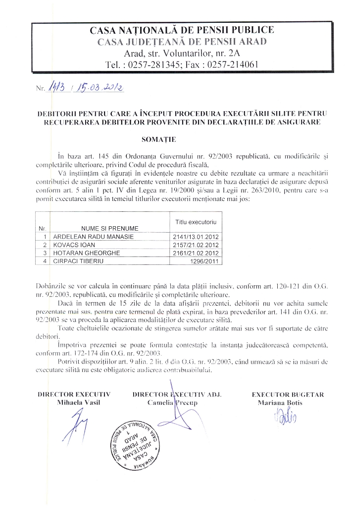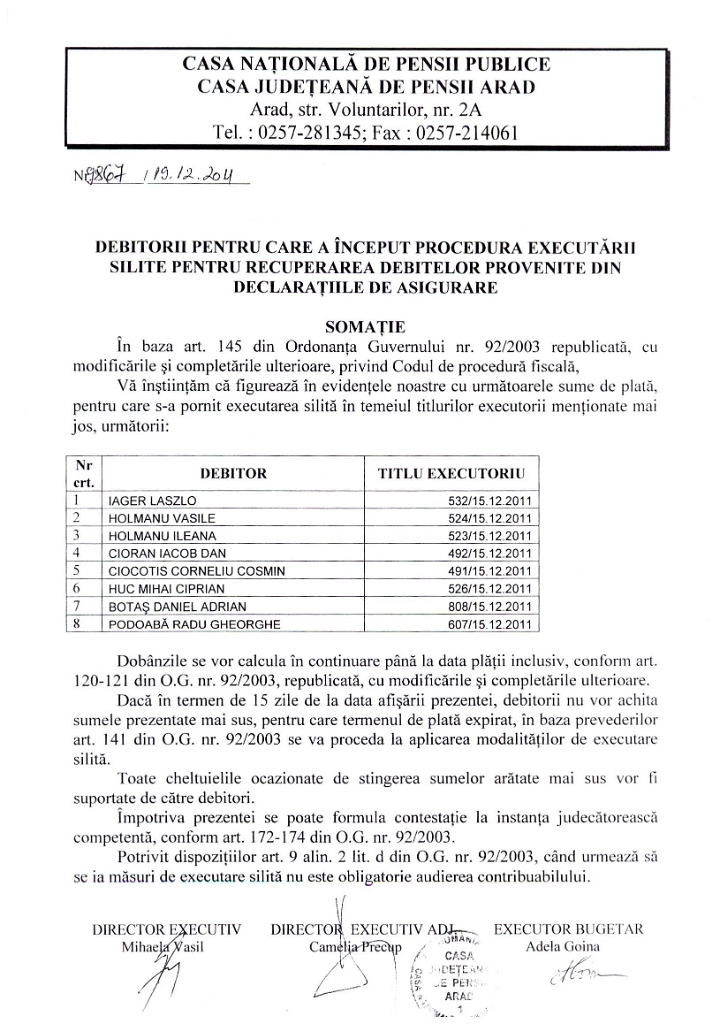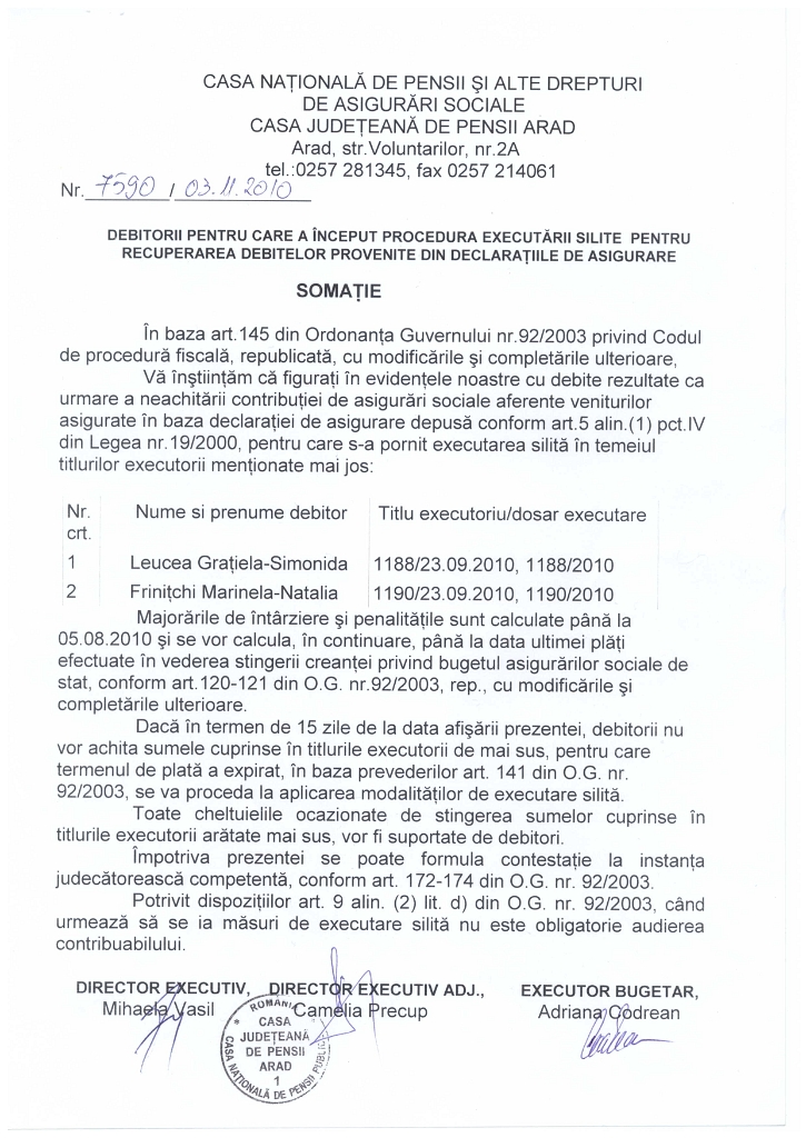 In temeiul art.44 alin.(2) lit.d si alin.(3) din OG nr.92/2003 privind codul de procedura fiscala asa cum a fost modificat si completat, Casa Judeteana de Pensii Arad, procedeaza la comunicarea prin publicitate a somatiilor pentru un numar de 105 debitori, persoane asigurate pe baza de declaratie de asigurare conform art. 5 alin.1 pct. IV din Legea nr.19/2000 cu modificarile si completarile ulterioare.