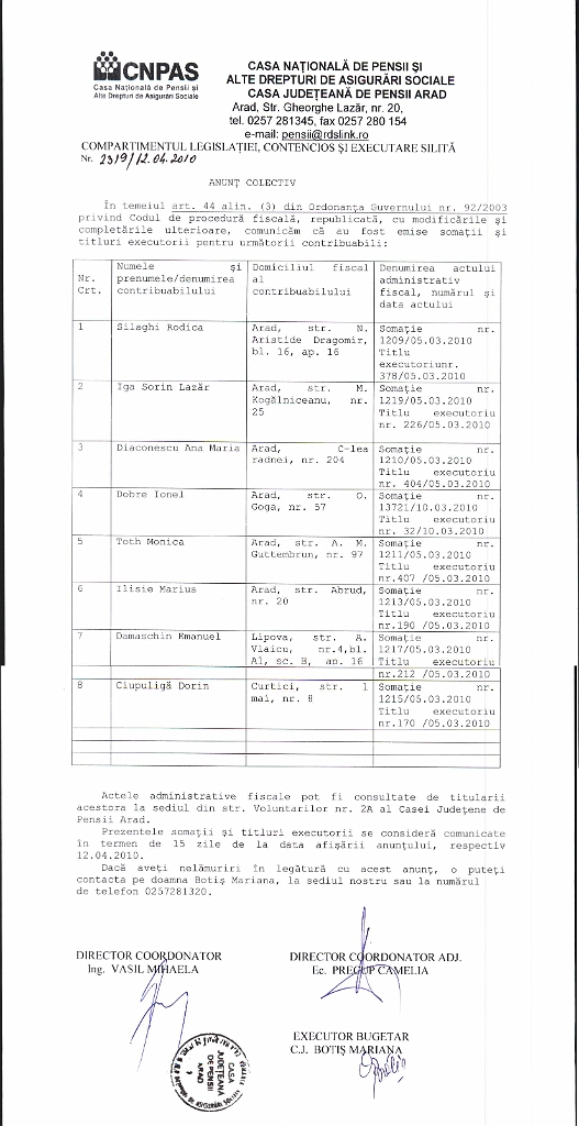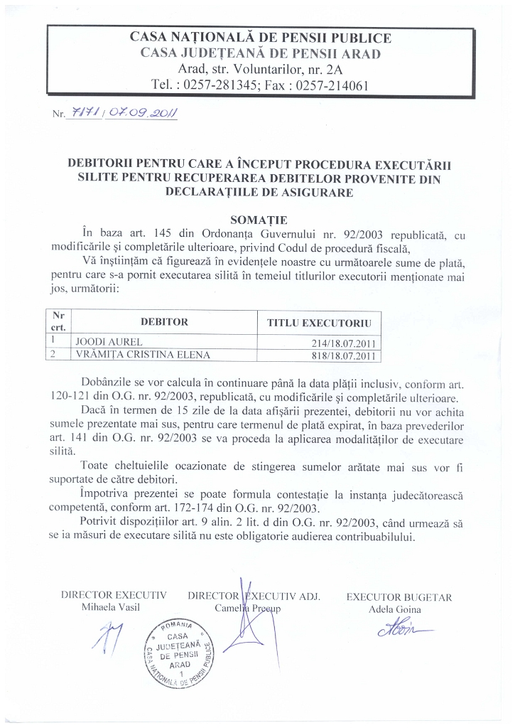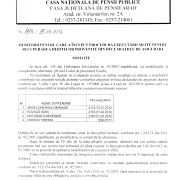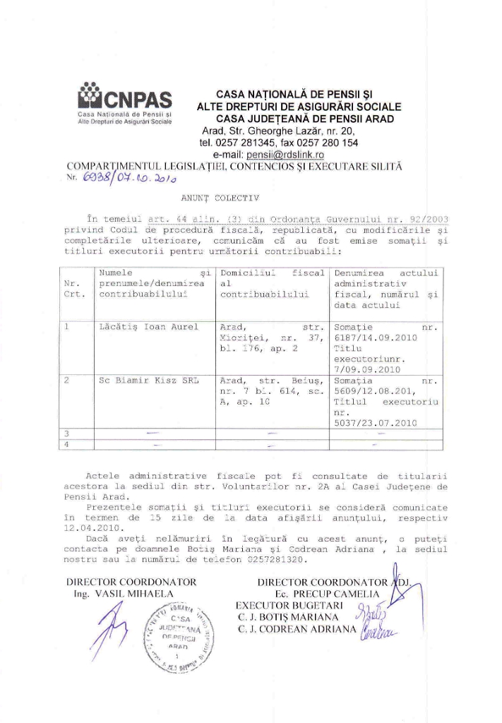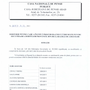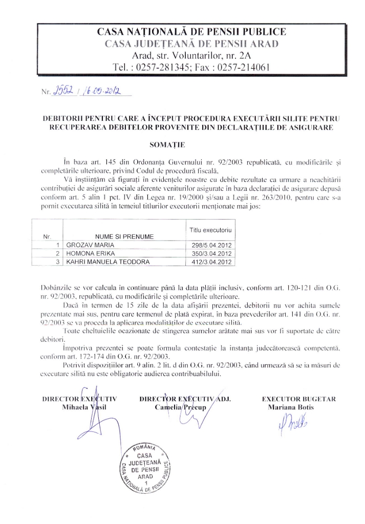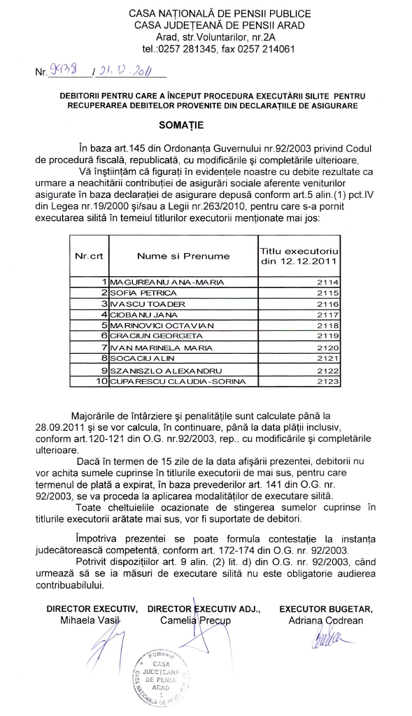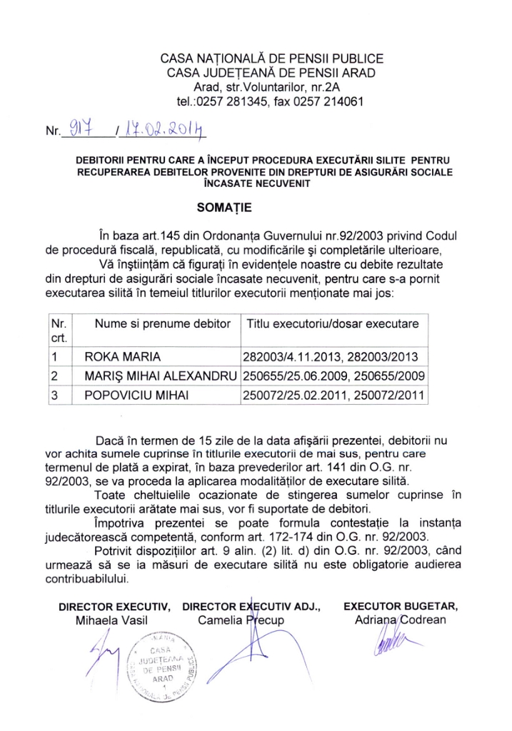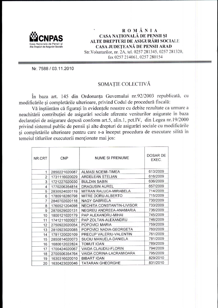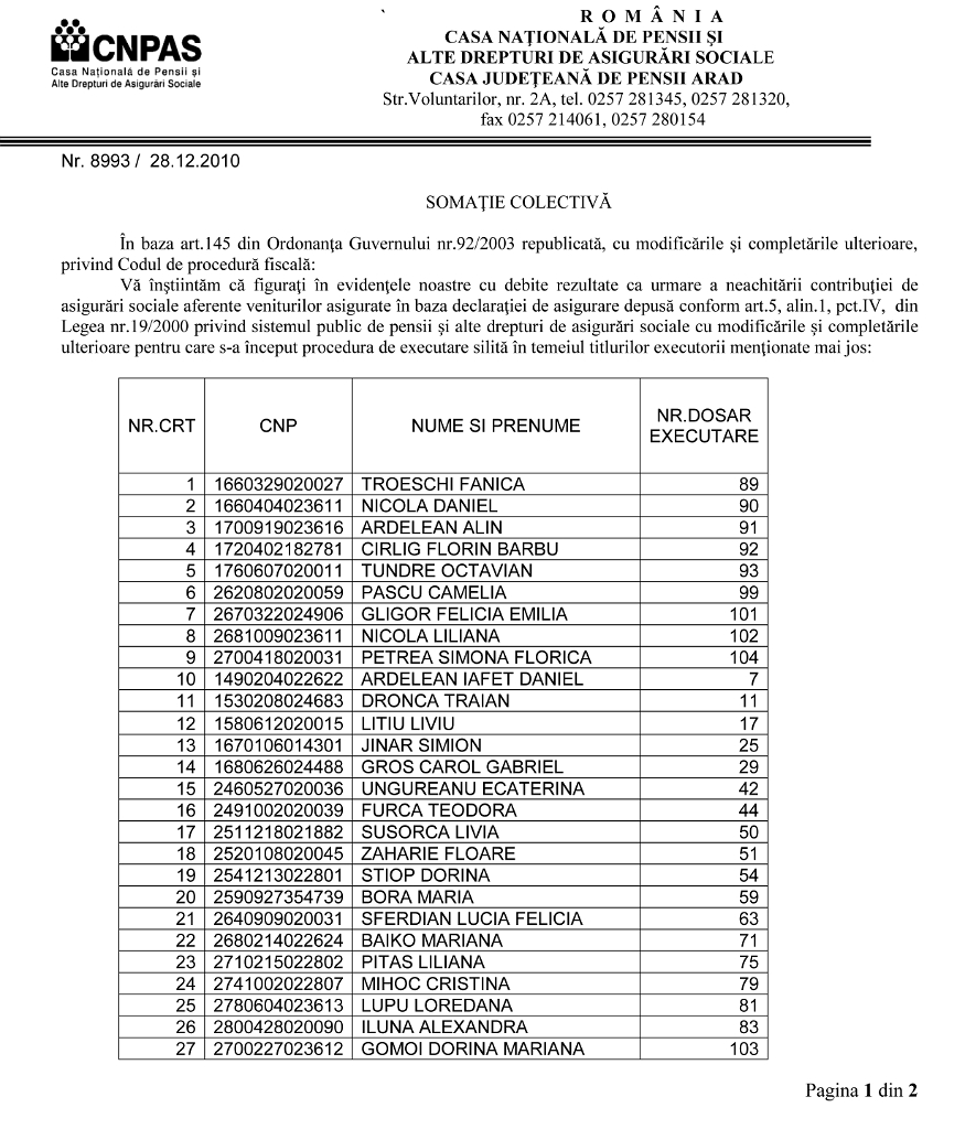 In temeiul art.44 alin.(2) lit.d si alin.(3) din OG nr.92/2003 privind codul de procedura fiscala asa cum a fost modificat si completat, Casa Judeteana de Pensii Arad, procedeaza la comunicarea prin publicitate a somatiilor pentru un numar de 105 debitori, persoane asigurate pe baza de declaratie de asigurare conform art. 5 alin.1 pct. IV din Legea nr.19/2000 cu modificarile si completarile ulterioare.