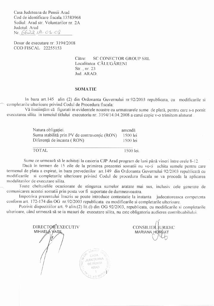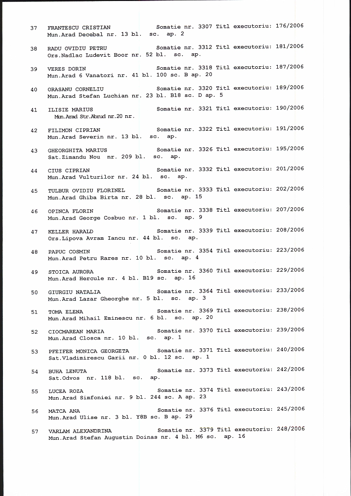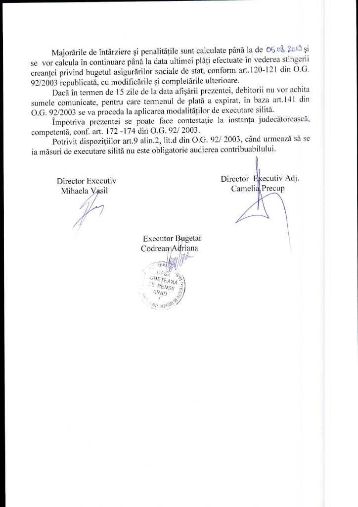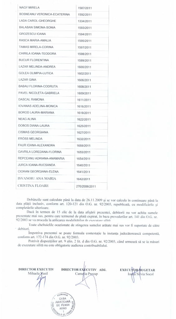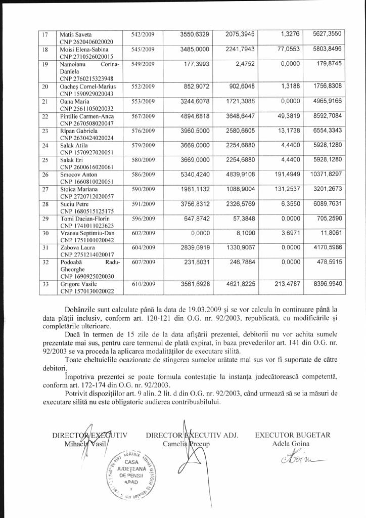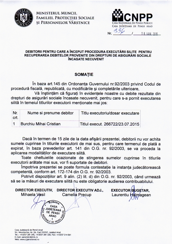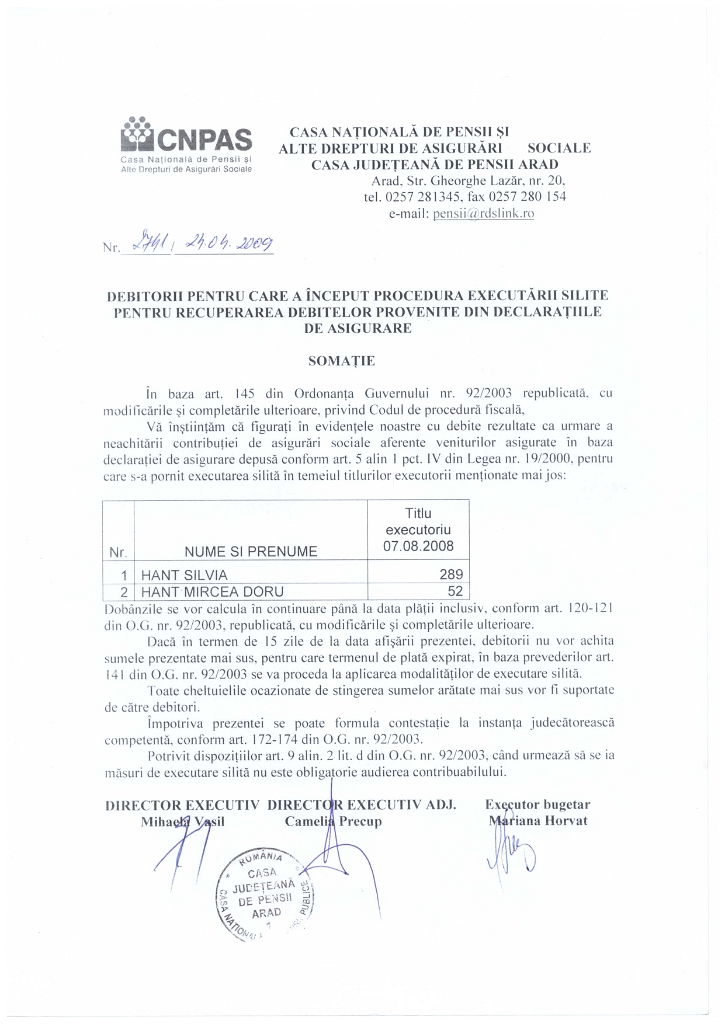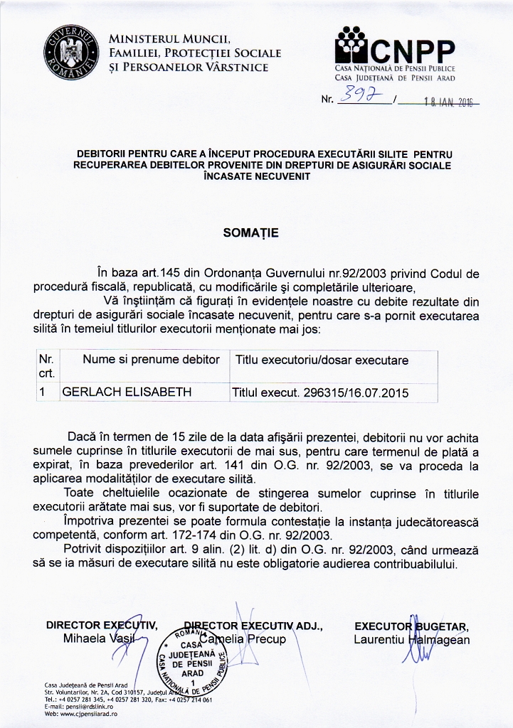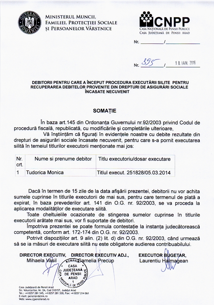 In temeiul art.44 alin.(2) lit.d si alin.(3) din OG nr.92/2003 privind codul de procedura fiscala asa cum a fost modificat si completat, Casa Judeteana de Pensii Arad, procedeaza la comunicarea prin publicitate a somatiilor pentru un numar de 105 debitori, persoane asigurate pe baza de declaratie de asigurare conform art. 5 alin.1 pct. IV din Legea nr.19/2000 cu modificarile si completarile ulterioare.