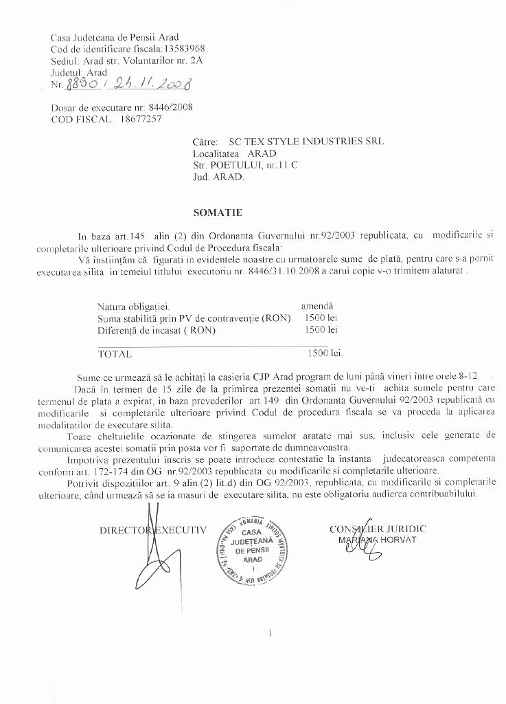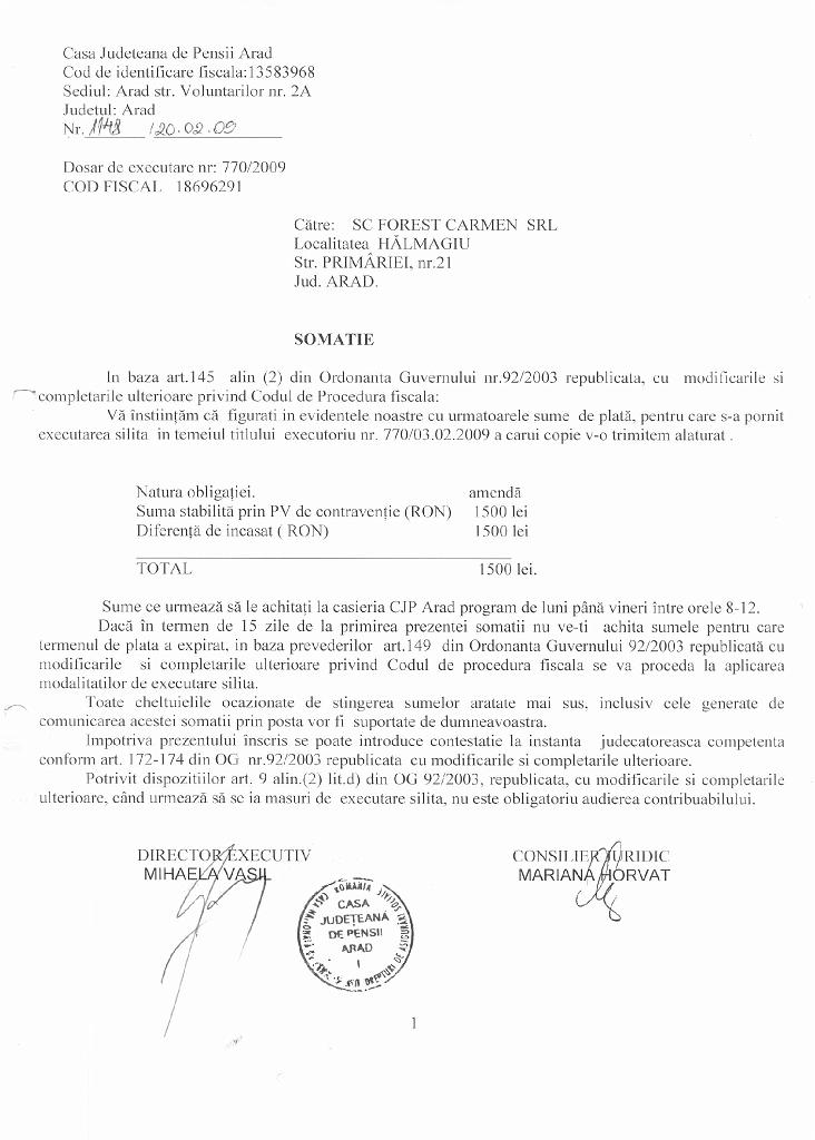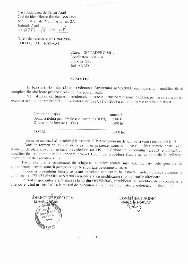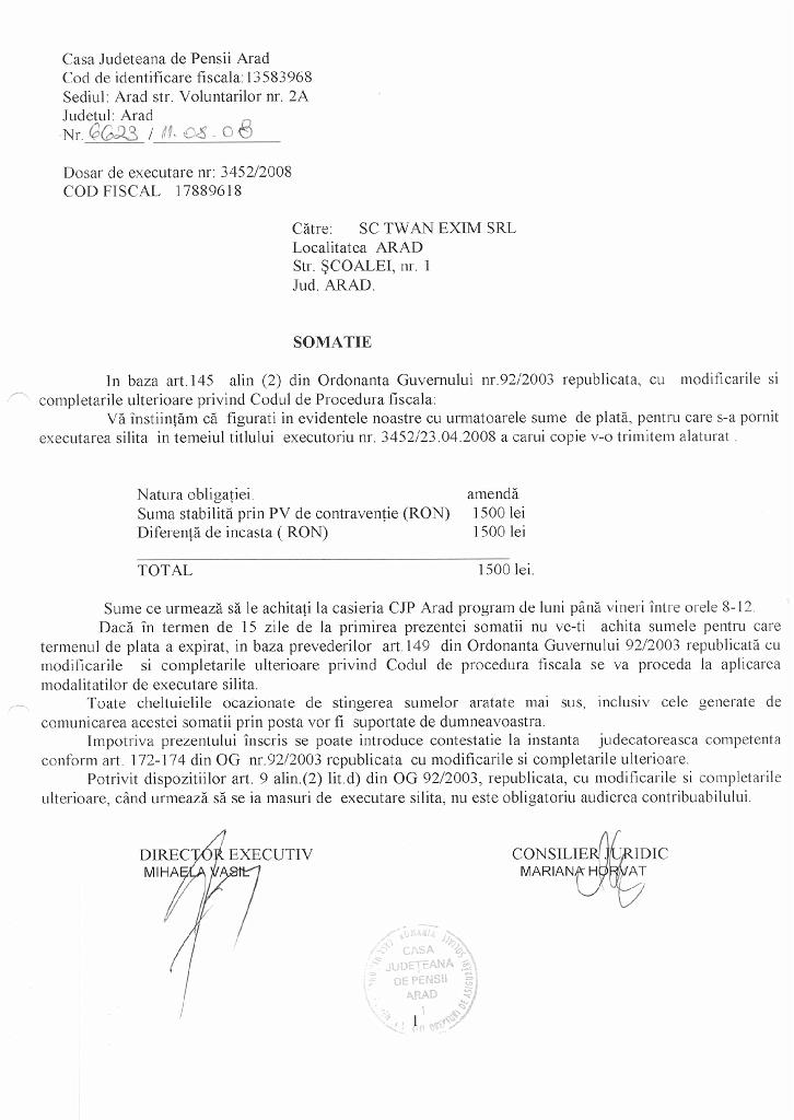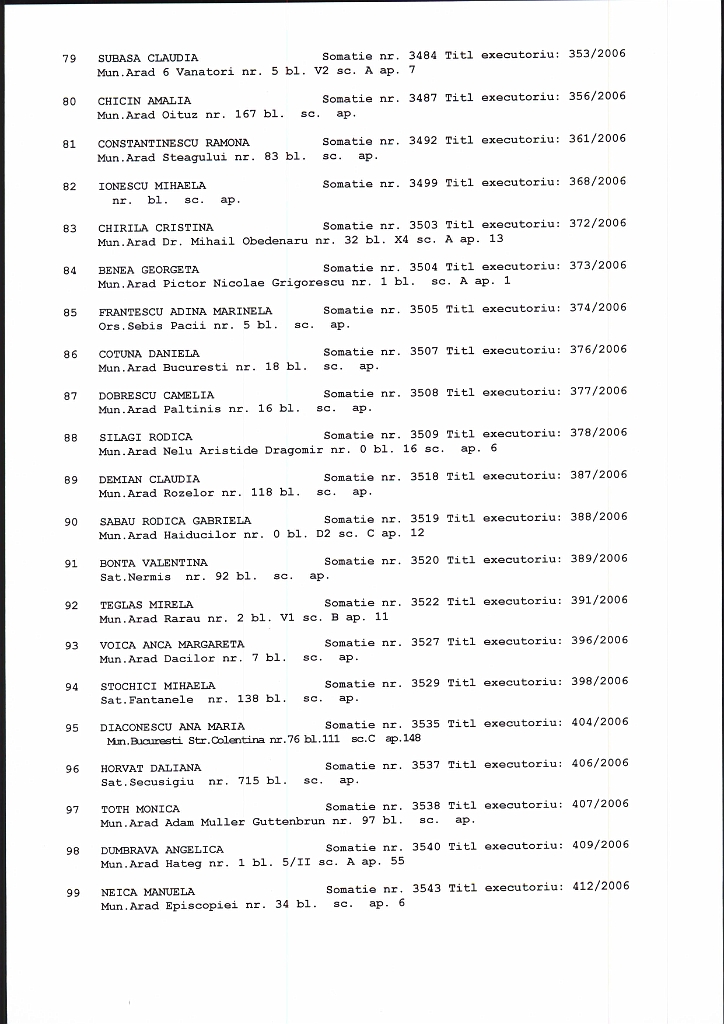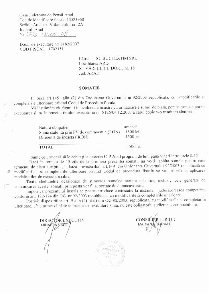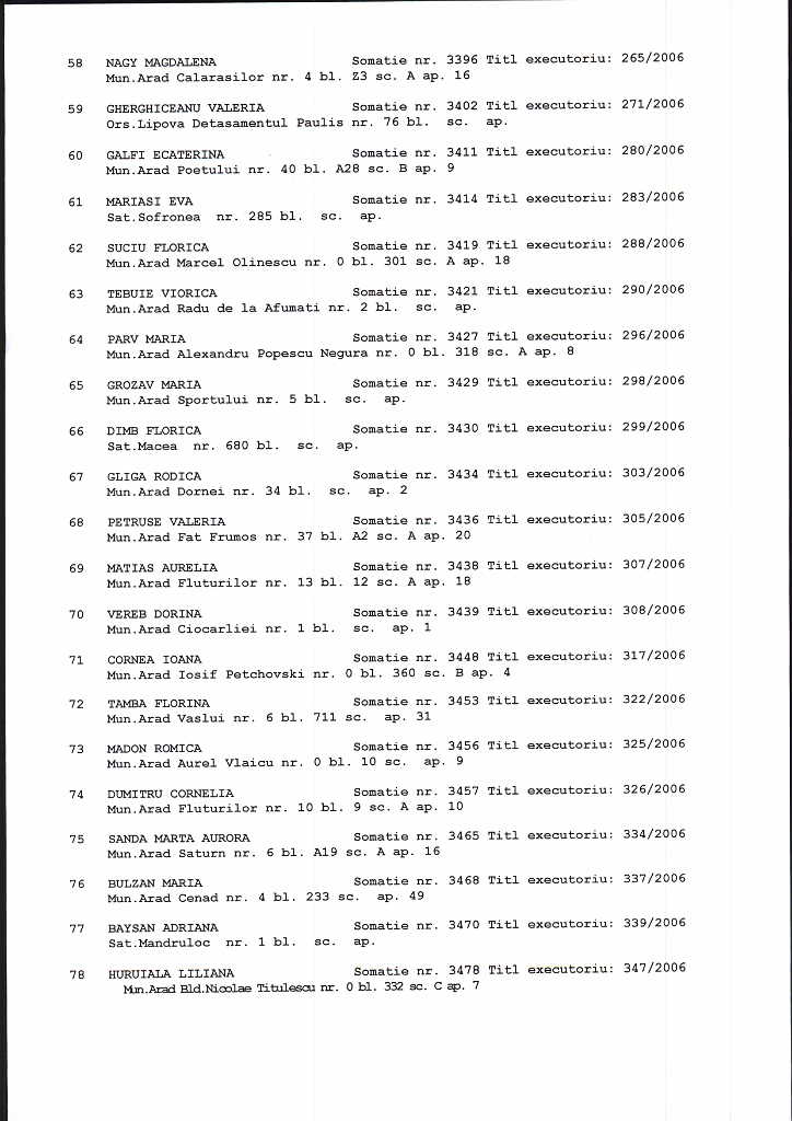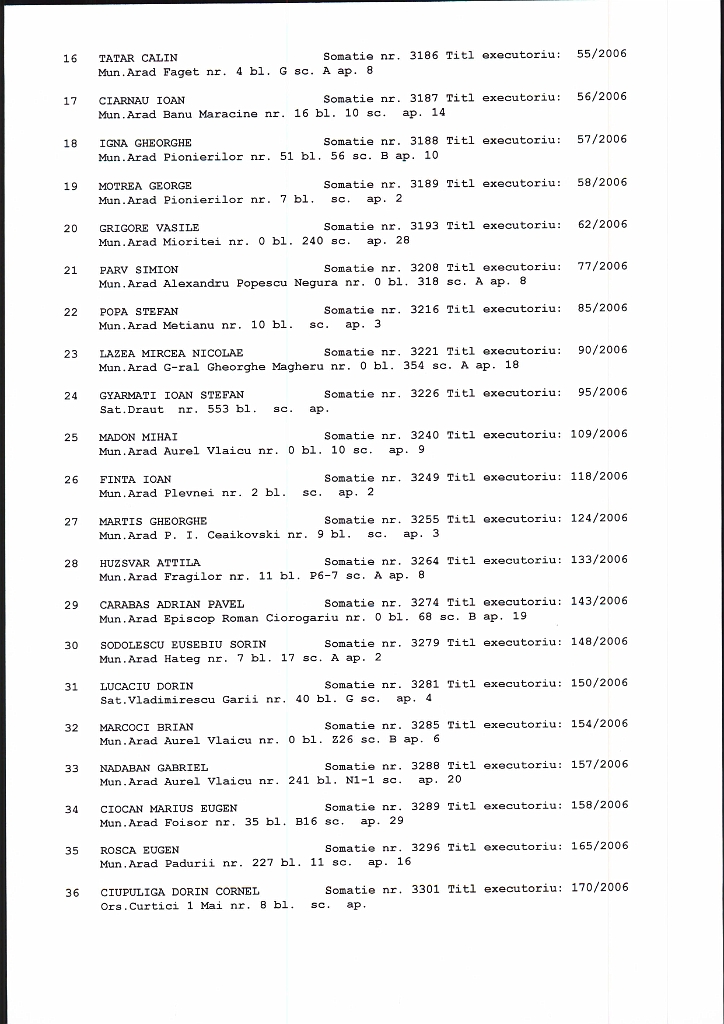 In temeiul art.44 alin.(2) lit.d si alin.(3) din OG nr.92/2003 privind codul de procedura fiscala asa cum a fost modificat si completat, Casa Judeteana de Pensii Arad, procedeaza la comunicarea prin publicitate a somatiilor pentru un numar de 105 debitori, persoane asigurate pe baza de declaratie de asigurare conform art. 5 alin.1 pct. IV din Legea nr.19/2000 cu modificarile si completarile ulterioare.
