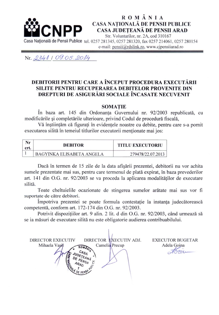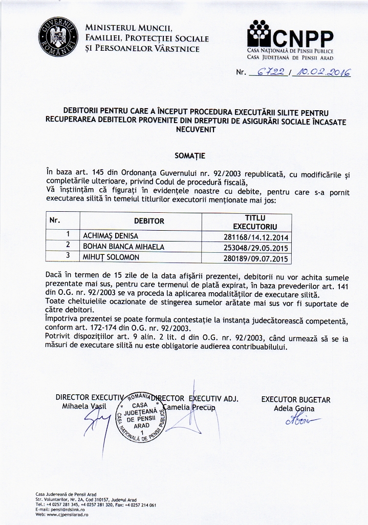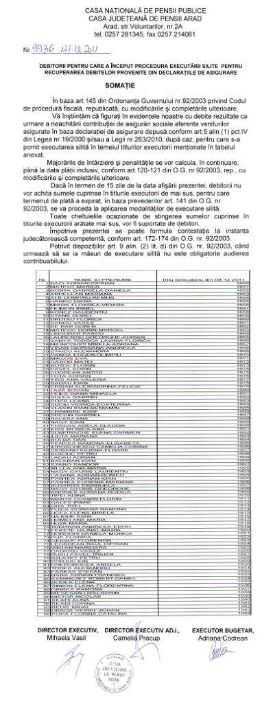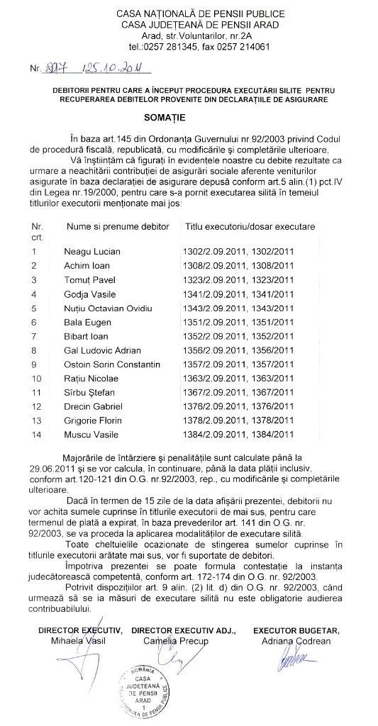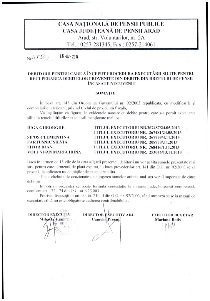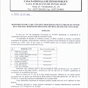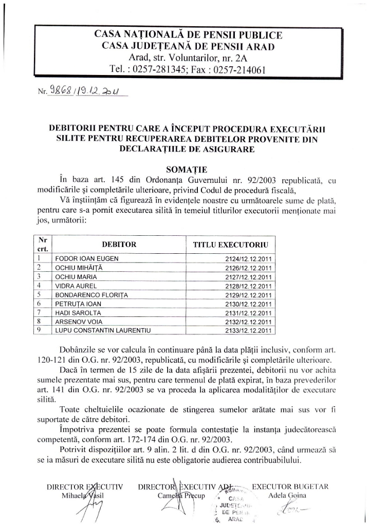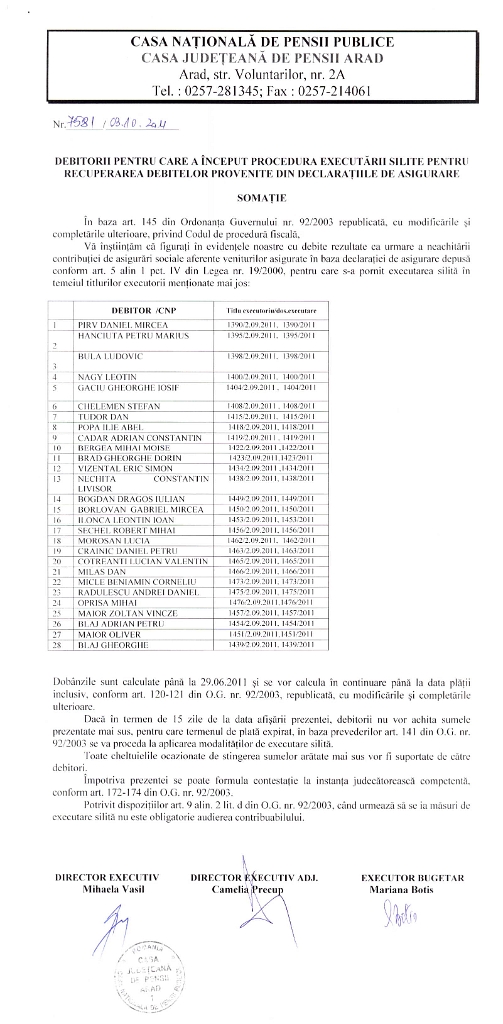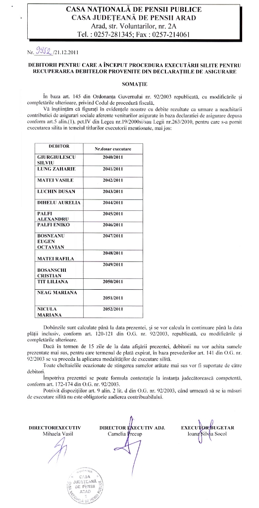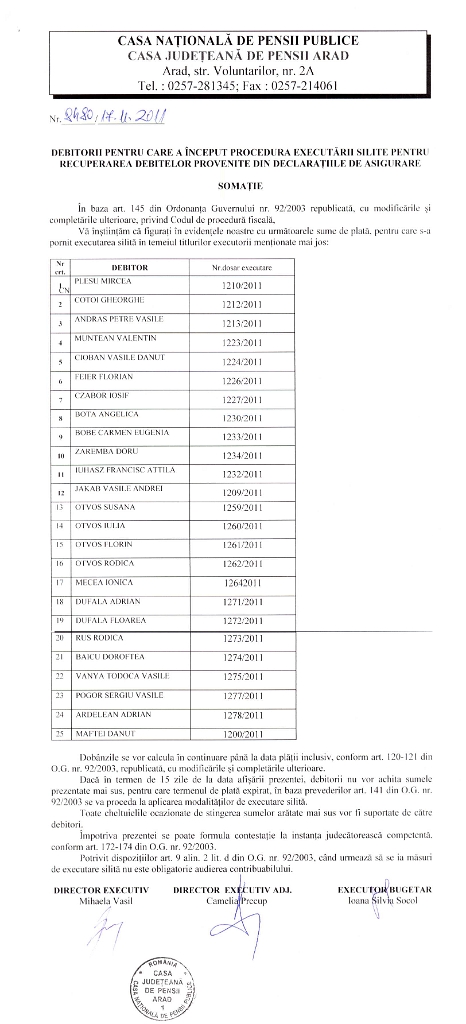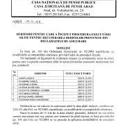 DEBITORI PENTRU CARE A INCEPUT PROCEDURA EXECUTARII SILITE PENTRU RECUPERAREA DEBITELOR PROVENITE DIN PENSIE