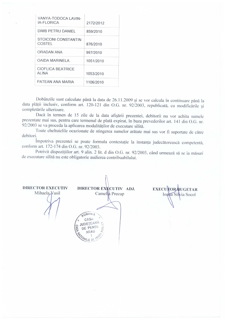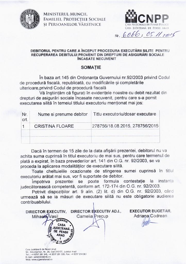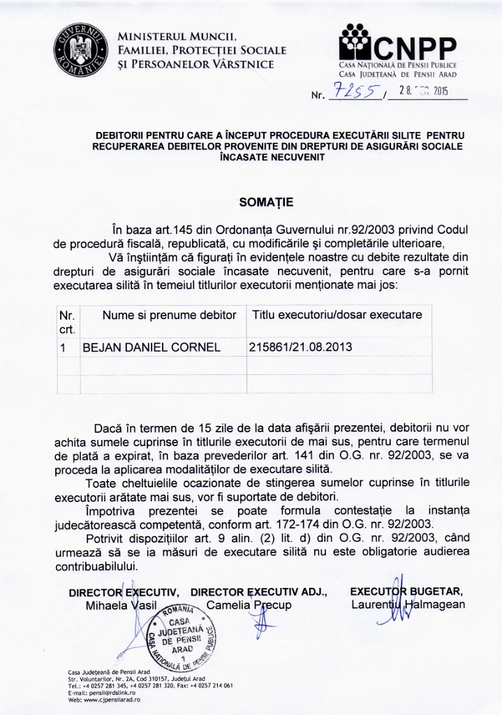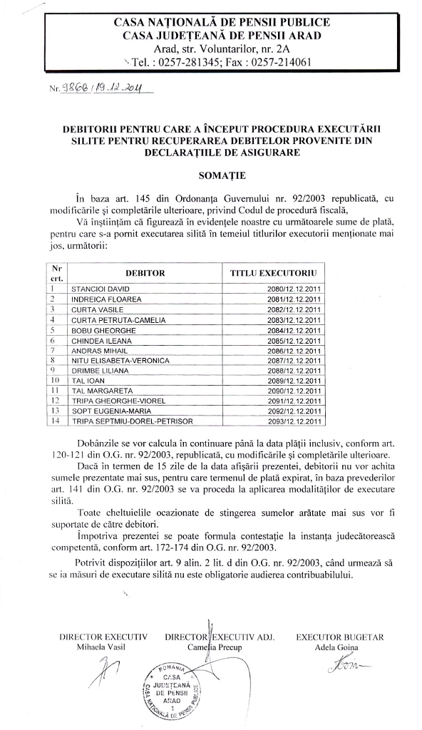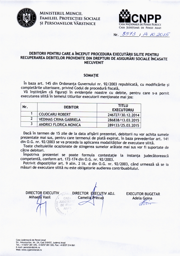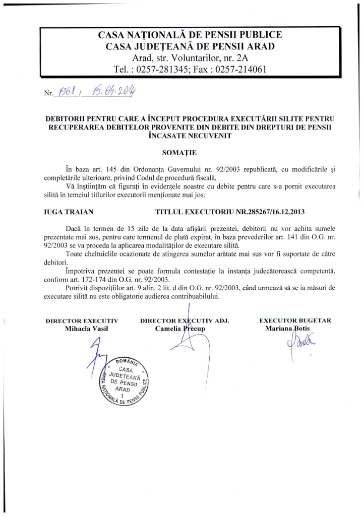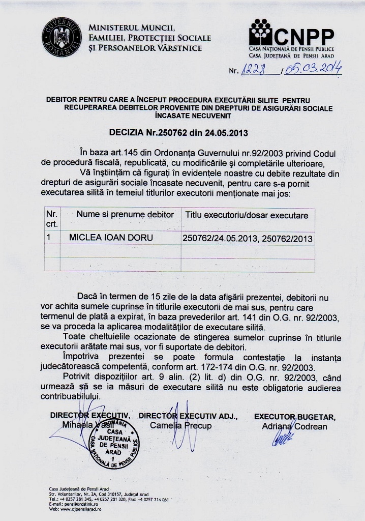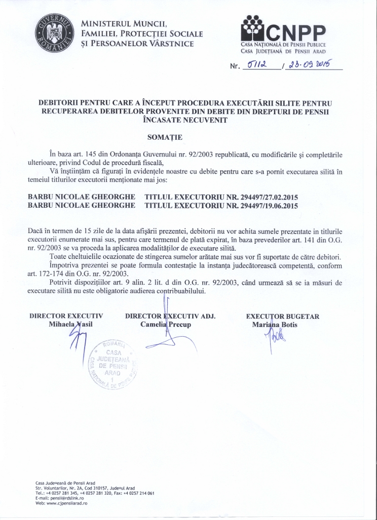 DEBITORI PENTRU CARE A INCEPUT PROCEDURA EXECUTARII SILITE PENTRU RECUPERAREA DEBITELOR PROVENITE DIN PENSIE