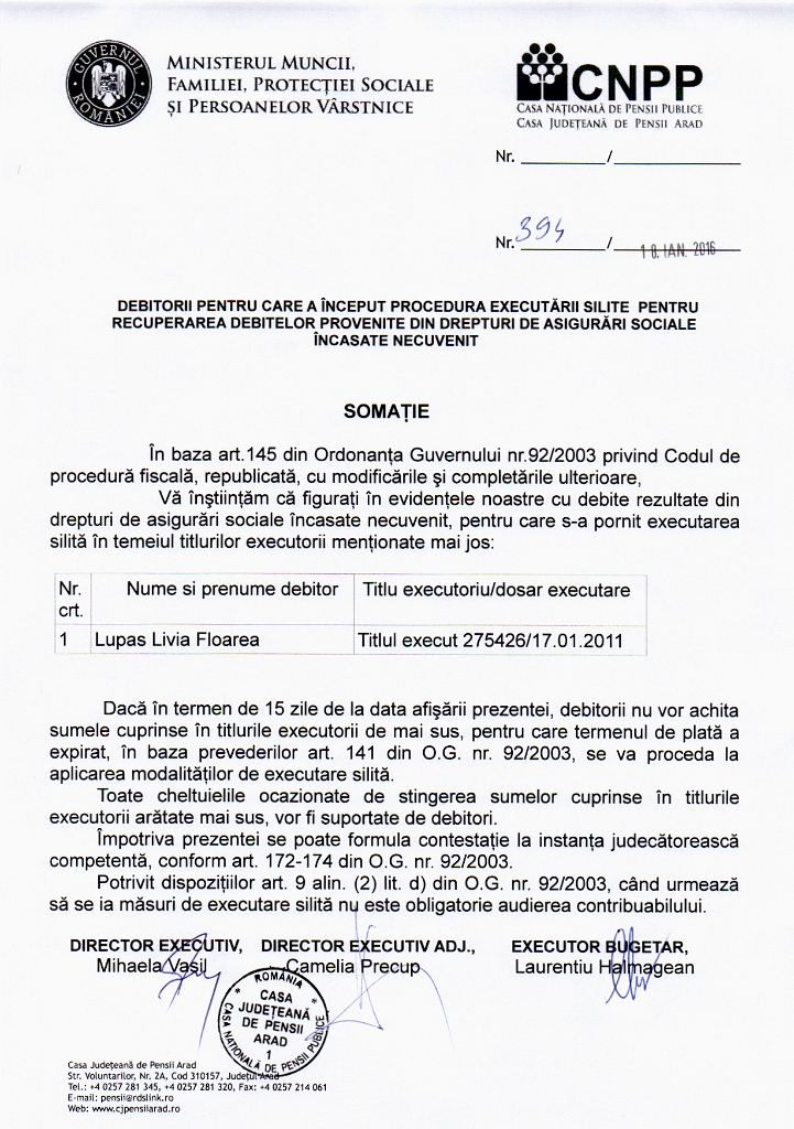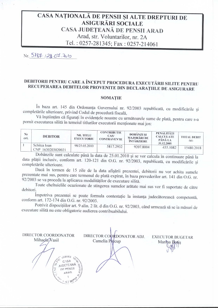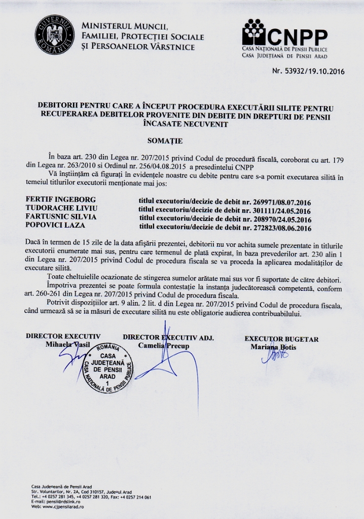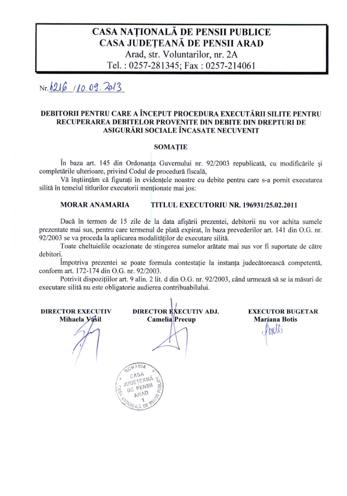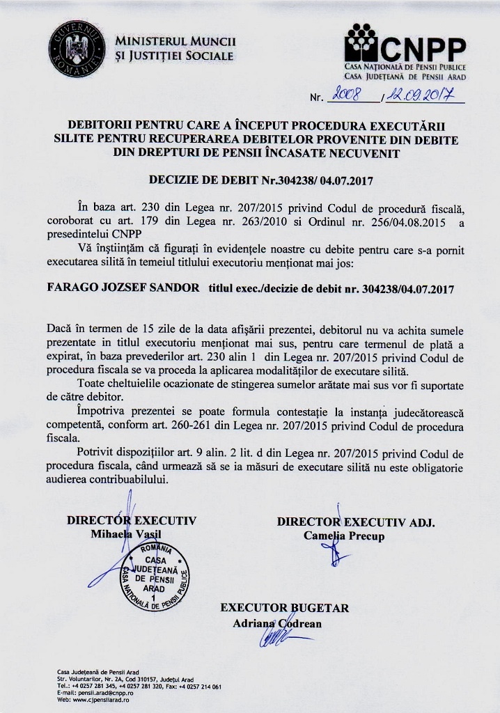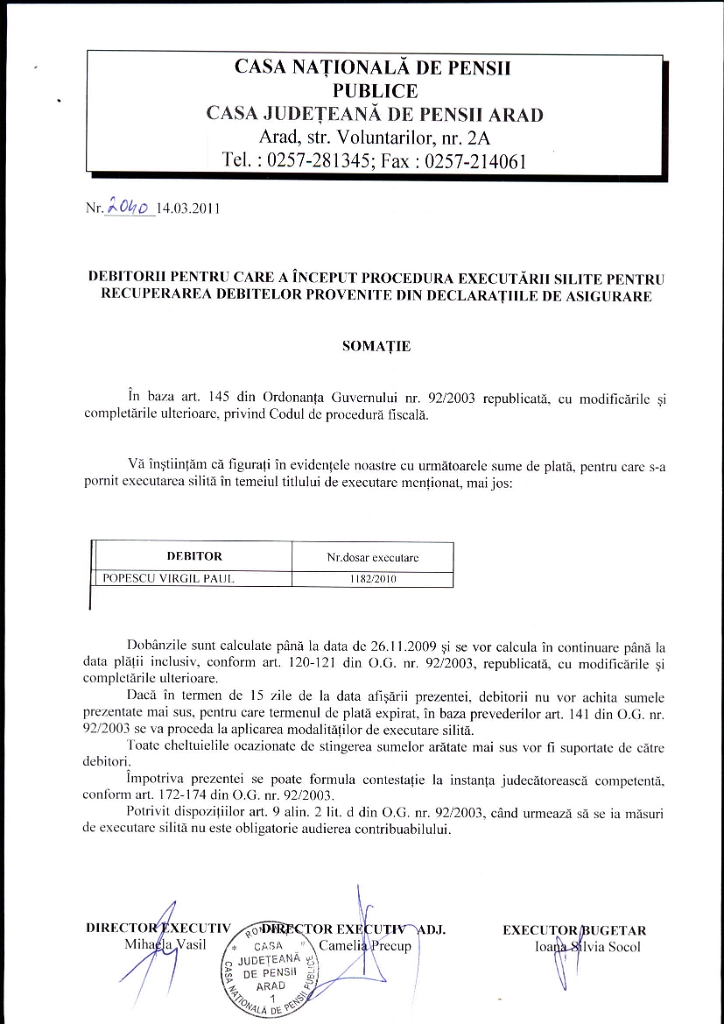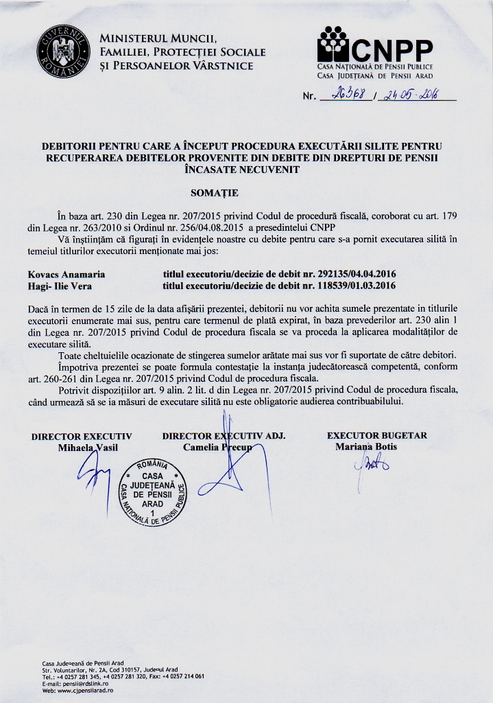 DEBITORI PENTRU CARE A INCEPUT PROCEDURA EXECUTARII SILITE PENTRU RECUPERAREA DEBITELOR PROVENITE DIN PENSIE