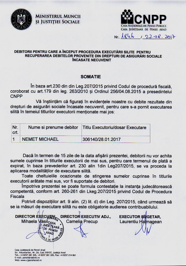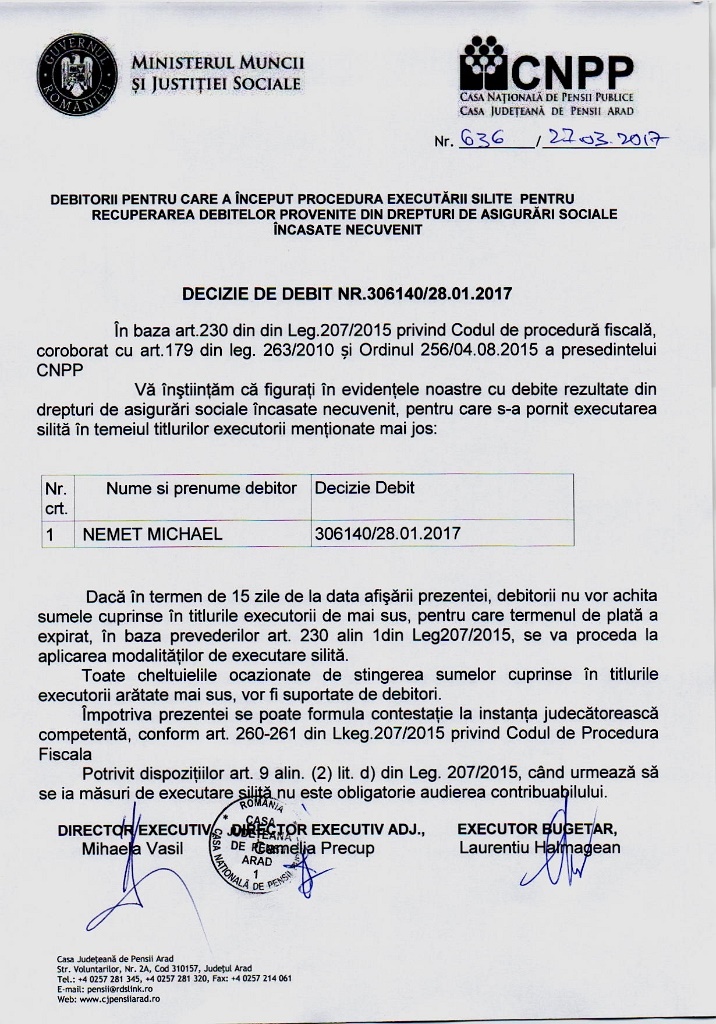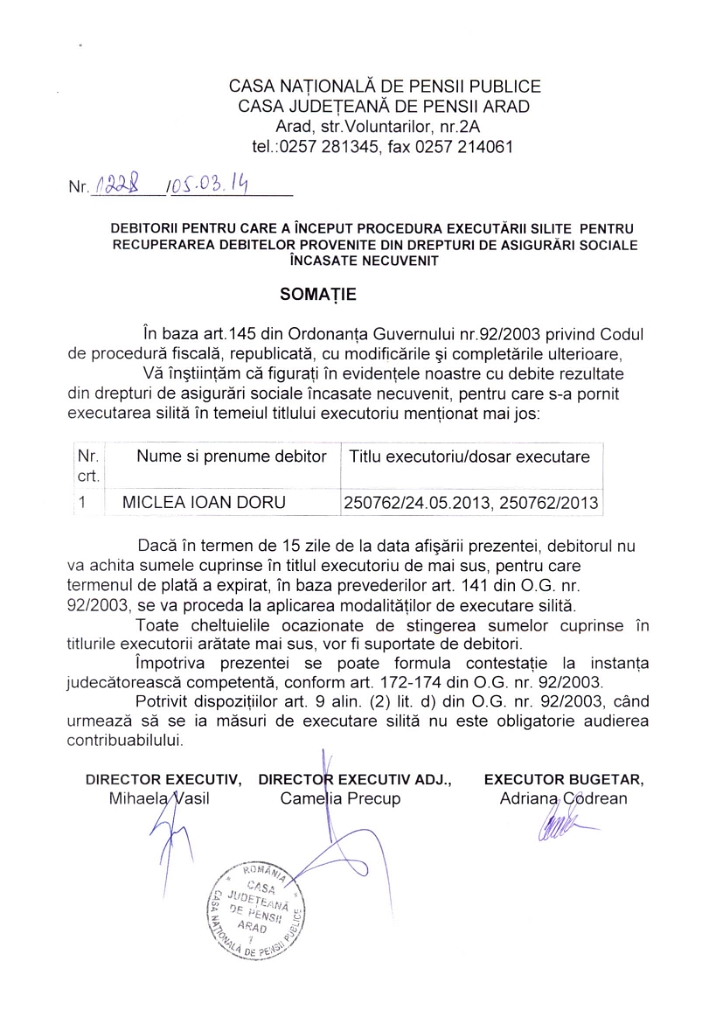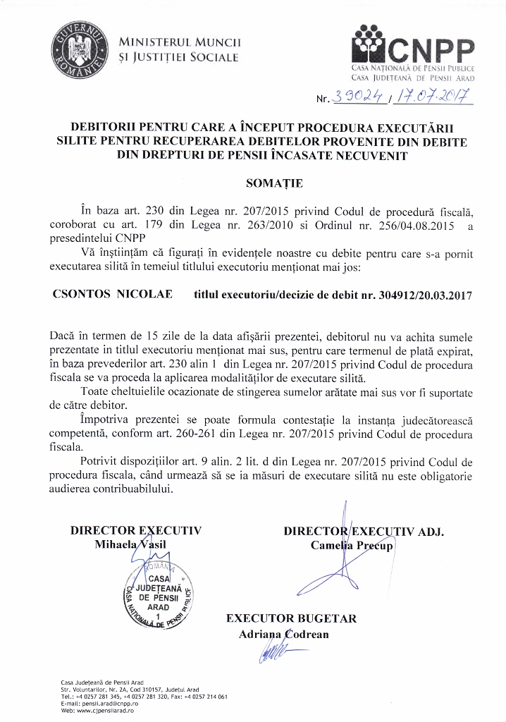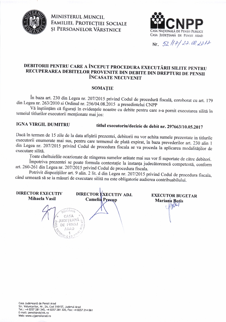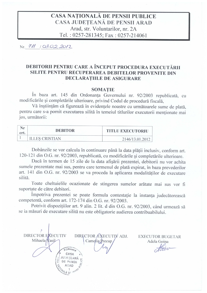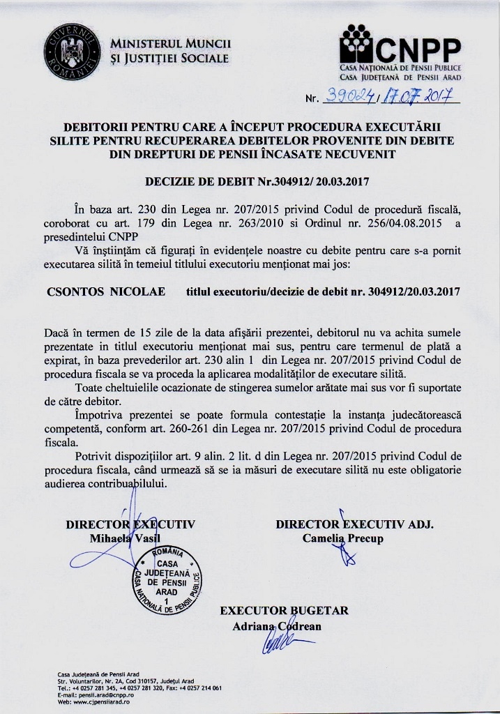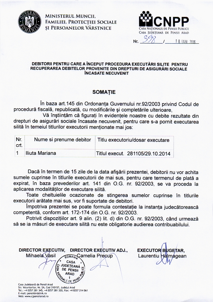 DEBITORI PENTRU CARE A INCEPUT PROCEDURA EXECUTARII SILITE PENTRU RECUPERAREA DEBITELOR PROVENITE DIN PENSIE