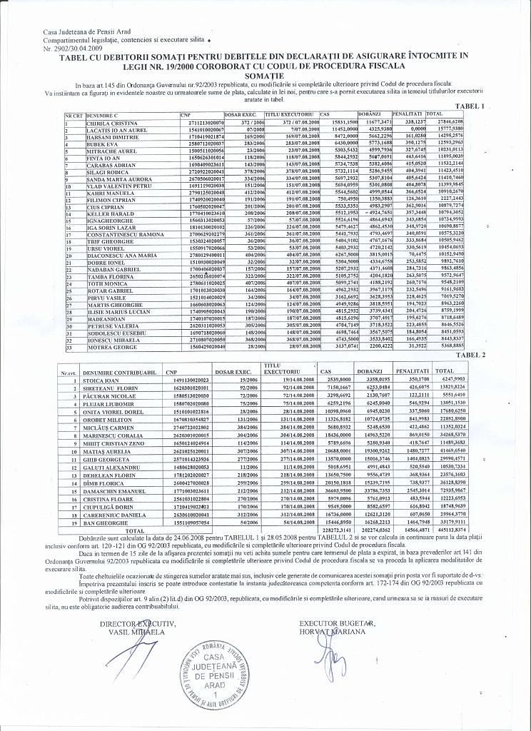 TABEL CU DEBITORII SOMATI PENTRU DEBITELE DIN DECLARATII DE ASIGURARE INTOCMITE IN BAZA LEGII NR. 19/2000 COROBORAT CU CODUL DE PROCEDURA FISCALA